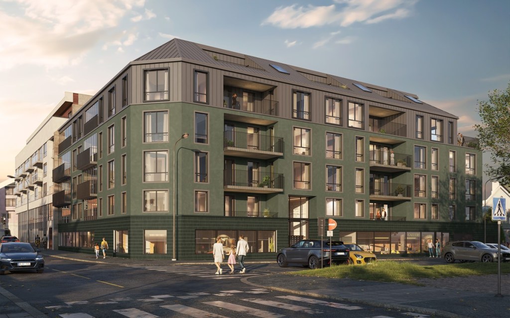 Type bygg: Nytt leilighetsbygg i seks etasjer med næring/parkering i 1. etg. og 36 leiligheter.