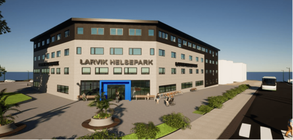 Type bygg: Helsehus i fire etasjer med parkeringskjeller og utomhusarbeider